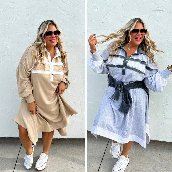 This varsity-inspired look is super cozy, oversized, and will definitely become your new favorite go-to dress!! Features a polo style collar with a deep button neckline, raw hemming and reverse terry fabric detailing on the front stripes, arms and bottom hemming. Every attention to detail was made with this amazing dress!