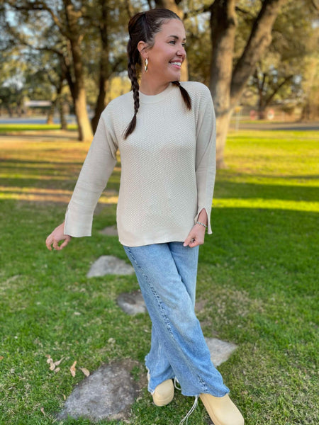 Upgrade your basics with this textured knit sweater. Featuring a drop shoulder design with a modern split cuff, round neckline and contrasting knit patterns. Available in four colors!