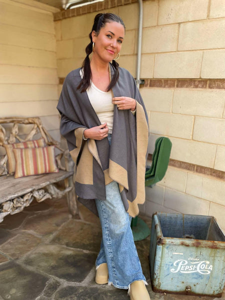 This cozy shawl wrap is so soft and versatile. Featuring a one size fit, contrasting hem and reversible design. Paired over a dress or with jeans, this shawl wrap is timeless.